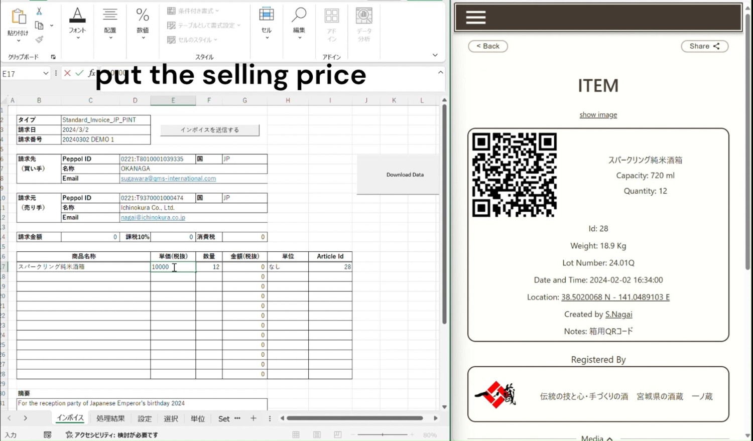 2 QRs were available, one is to show the certificate of origin (the tasting Sake really produced by Ichinokura, Ichinokura's president gave a special message to this particular party!) and the other is to show the traceability (lot number, quantity and other data taken in their factory). Those QRs conveyed to the participants that Ichinokura’s pride and tradition of Sake production with quality being delivered from Sendai, Japan.