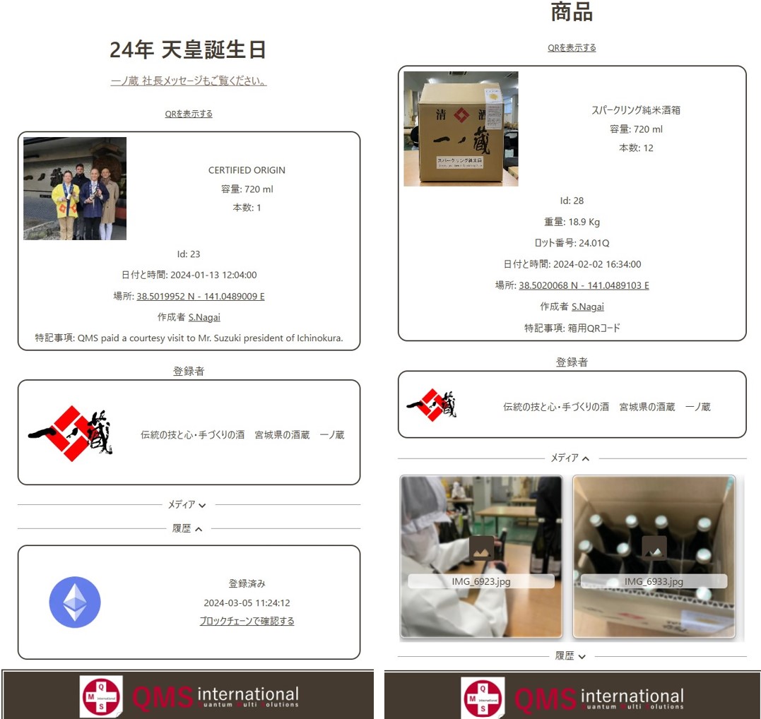 202438日にローマ(イタリア)で行われたレセプションパーティーに参加された株式会社 一ノ蔵さんは、国際舞台での差別化の試みとして、QMS-TRACEをプロモーションに使ってくださいました。日本酒2種類の瓶と二次元コードのみが置かれた試飲ブースは、デジタルと伝統の融合を象徴していました。
