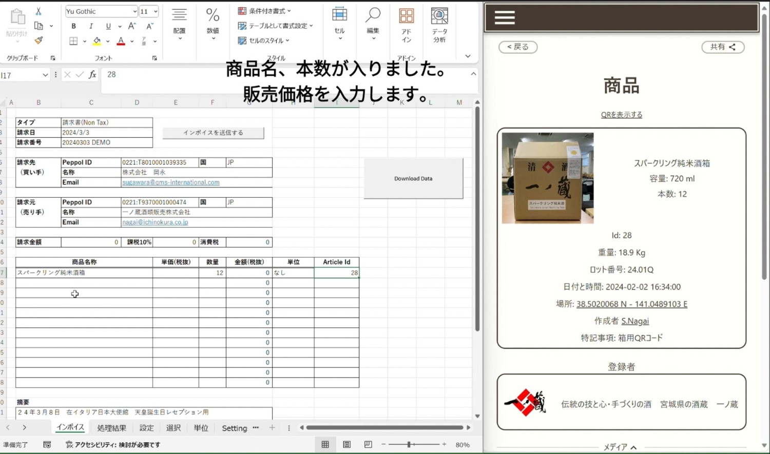 試飲会で提供されたお酒が本当に一ノ蔵さんで作られたものであることを証明する二次元コードと、今 手にしている瓶が確かに日本から輸送されてきていることを証明する二次元コードの2つを用意し、酒造りの誇りと伝統が遠く離れた異国の地に間違いなく届けられていることを伝えました。