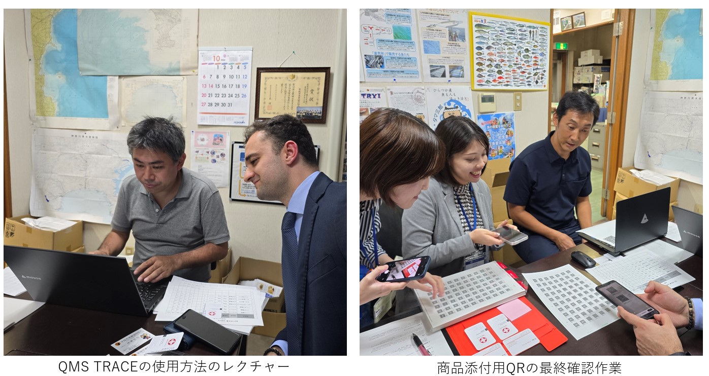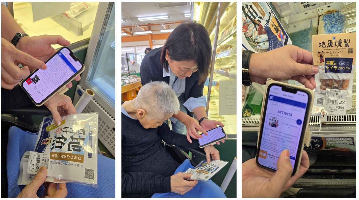 実証開始前日の1016日に、平塚市産業振興課の皆さんと平塚漁協の事務所で、製品に添付する二次元コードの情報確認など、安心を届けるのに万全を期すための最終の打合せを持ちました。漁協の扱う商品が、いつ、どの会社から納入され、いつ、あさつゆ広場の店頭に並ぶのか、というサプライチェーンをアプリに入力していきます。出来上がった二次元コードから消費者の方が読み取る情報の内容確認も行いました。